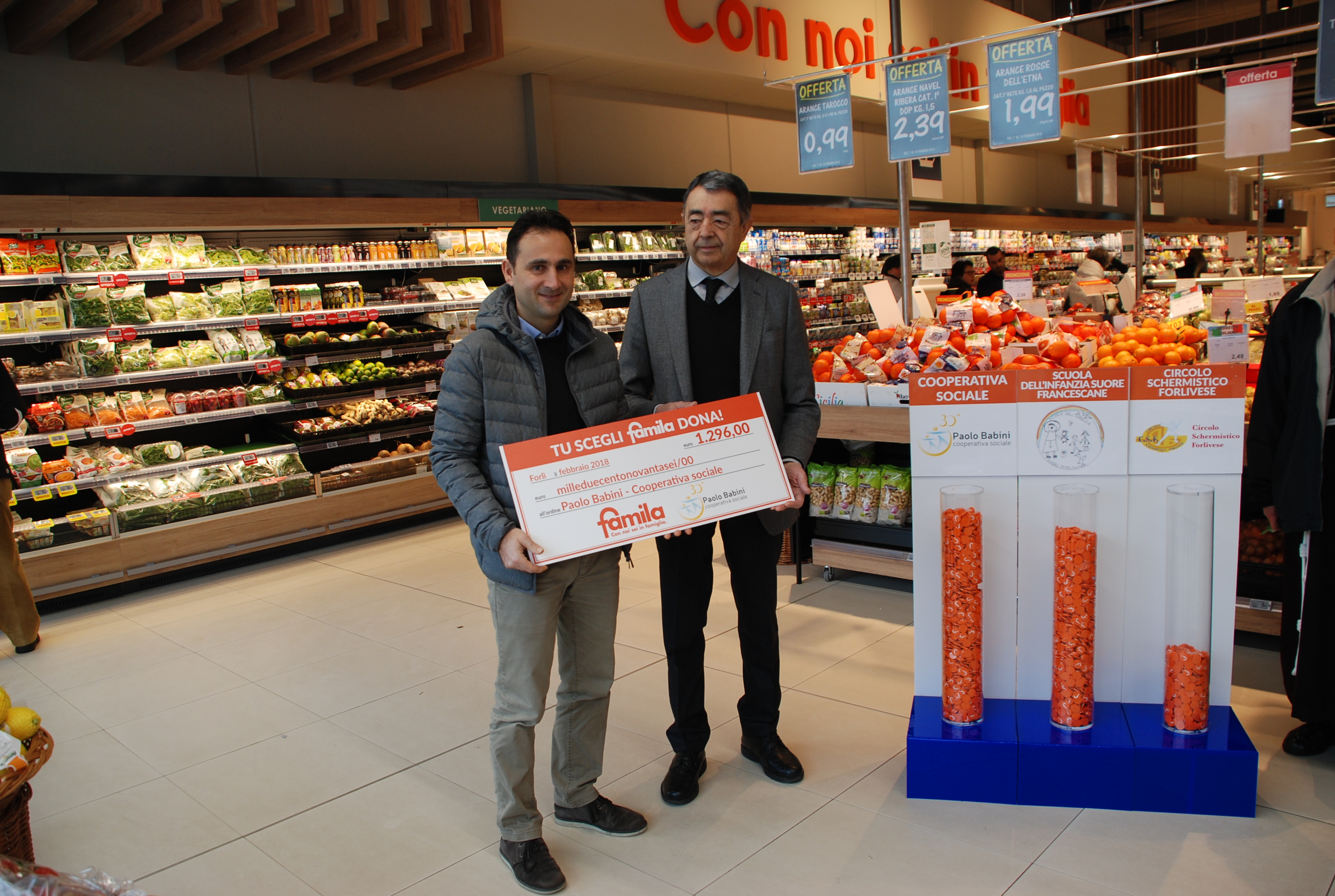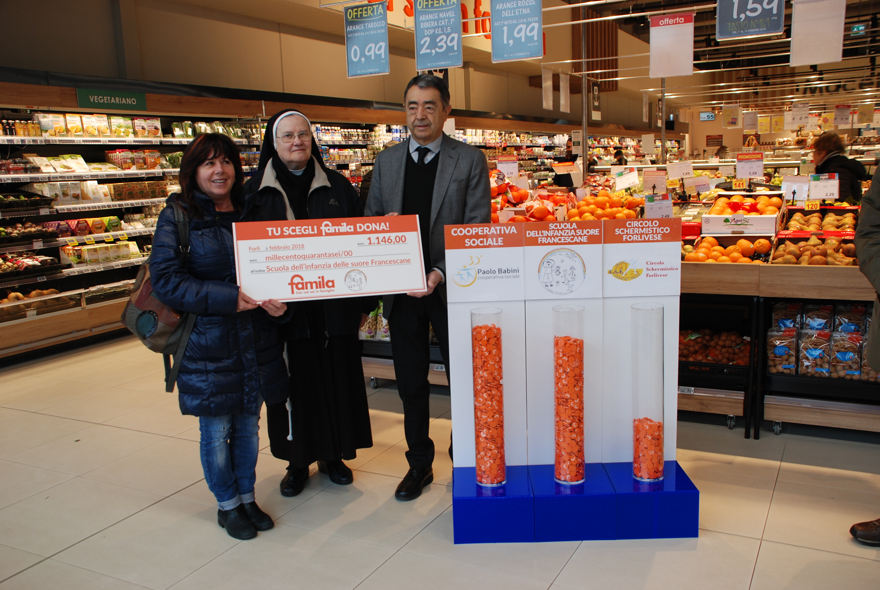 L’iniziativa ha permesso di sostenere attivamente tre importanti associazioni del territorio: la Cooperativa Paolo Babini, la scuola dell’infanzia Suore Francescane e il Circolo Schermistico Forlivese. Fino al 31 gennaio 2018, era infatti possibile scegliere a quale di queste tre donare il gettone ricevuto durante la spesa in uno dei supermercati Famila aderenti all’iniziativa. La stessa Famila ha donato un totale di 3.000 euro, distribuite a ciascuna associazione proporzionalmente al numero di gettoni ricevuti.